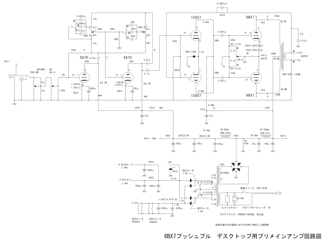 パワーアンプ部分は6BX7のプッシュプルを12AX7の差動回路でドライブするものです。十分なダンピングファクタを得るためにNFBを14dB