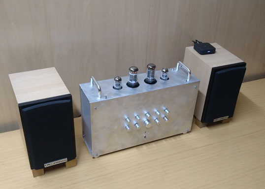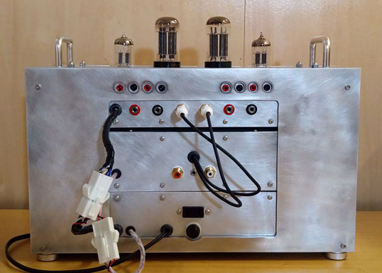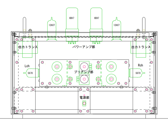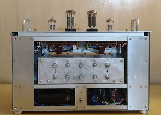 容易にできました。出力管のバイアス調整は頂部の化粧パネルを外してシャーシ上部に設けた穴から半固定ボリウムを調整するようにしています。また、出力管