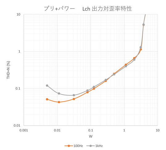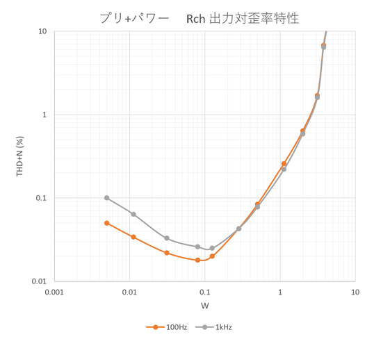 Rchを測定しましたが、右チャンネルのひずみが大変低くできました。しかしながら実測した残留雑音と信号の割合から考えてRchの0.1Wより下の数値は少なすぎると思