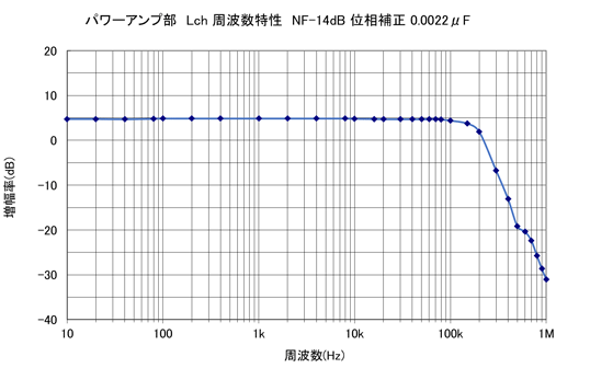プリメインアンプ全体での周波数特性を測定しました。トータルのゲインは15.4倍(23.7dB/1kHz)となりました。トーンコントロールを フラットにした場合でも周波数特性のうねりが少しあります。20-40kHzの範囲で、1kHzを基準として20Hzで+0.39dB、16kHzで -0.29dB(Lch)ありましたが、この程度であれば許容できると判断しました。また、パワーアンプ部単体での周波数特性も測定しましたが、高域に大きなピークがなく 素直な特性になっています。
